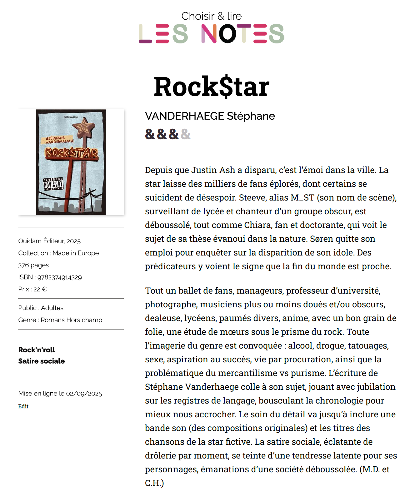 Une virtuosité ébouriffante dans la mise en place d’un univers imaginaire plus vrai que nature […] Ce roman, c’est un voyage vitaminé et survolté dans l’imagerie du rock […] Une expérience riche en péripéties, hyper pointue dans son contenu et sa construction, mais teintée d’un humour salutaire et servie par un style impeccablement balancé. Nul besoin d’être calé en rock pour apprécier le voyage, foi d’ignare en la matière. C’est surtout la littérature qui est à l’œuvre ici, en toute majesté.