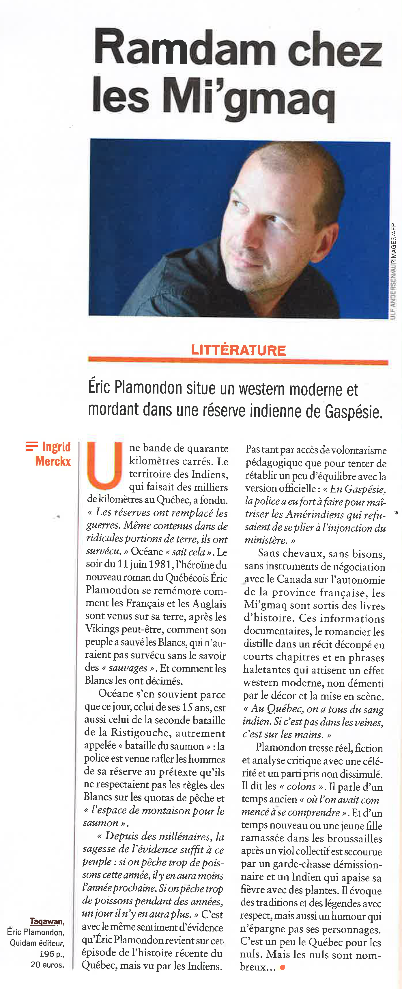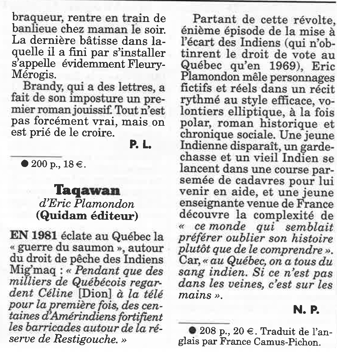 Follement romanesque, brillant, étincelant, glaçant par instants, un roman d’aventures au sens qu’en donnaient Jack London, Herman Melville et Joseph Conrad qui veillent, en écrivains complices, sur Taqawan et Éric Plamondon.