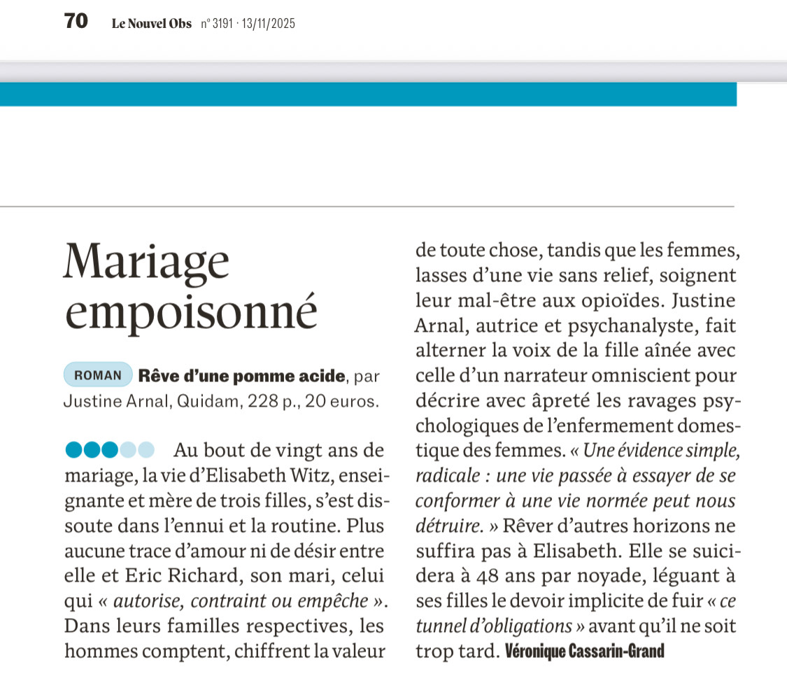 « En Lorraine, une part de quiche. En Alsace, une tarte flambée », à mi-chemin entre les deux, un lotissement, une famille et un suicide. Celui d’Élizabeth Vitz, une Alsacienne mariée à Éric Richard, un lorrain. Mère de trois filles qui resteront sans nom : l’étudiante, la lycéenne et l’écolière. À la fois grave et légère, Justine Arnal exhibe dans Rêve d’une pomme acide la laideur de la vie ordinaire qui met au monde des orphelins.