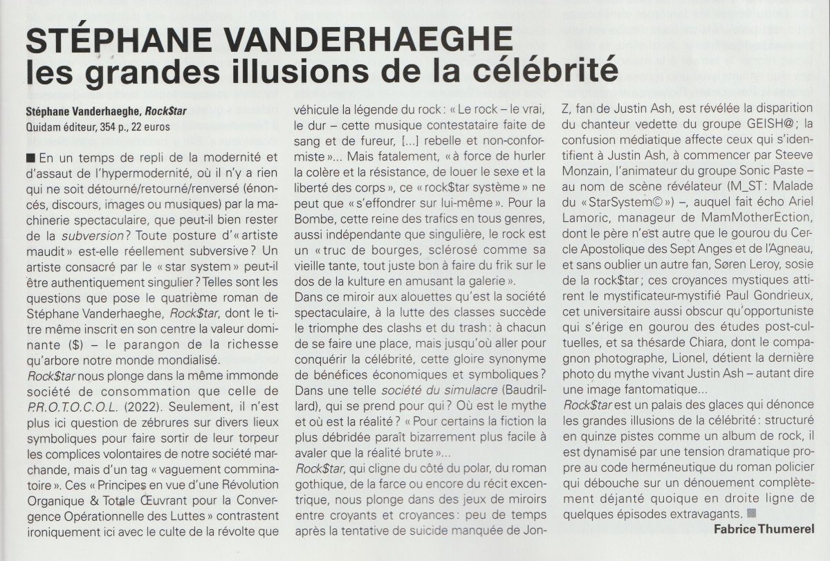 Bienvenue dans l’univers de l’hypermodernité, où règne la «subdiversion» ou le «subdivertissement», c’est comme on voudra, et dont la valeur suprême est inscrite au centre même du titre Rock$tar […] .De subtils jeux de miroirs entre polar, roman gothique, farce ou encore récit excentrique, poussant jusqu’à l’extrême les protocoles romanesques de ces genres pour aboutir à un roman des plus déjantés.