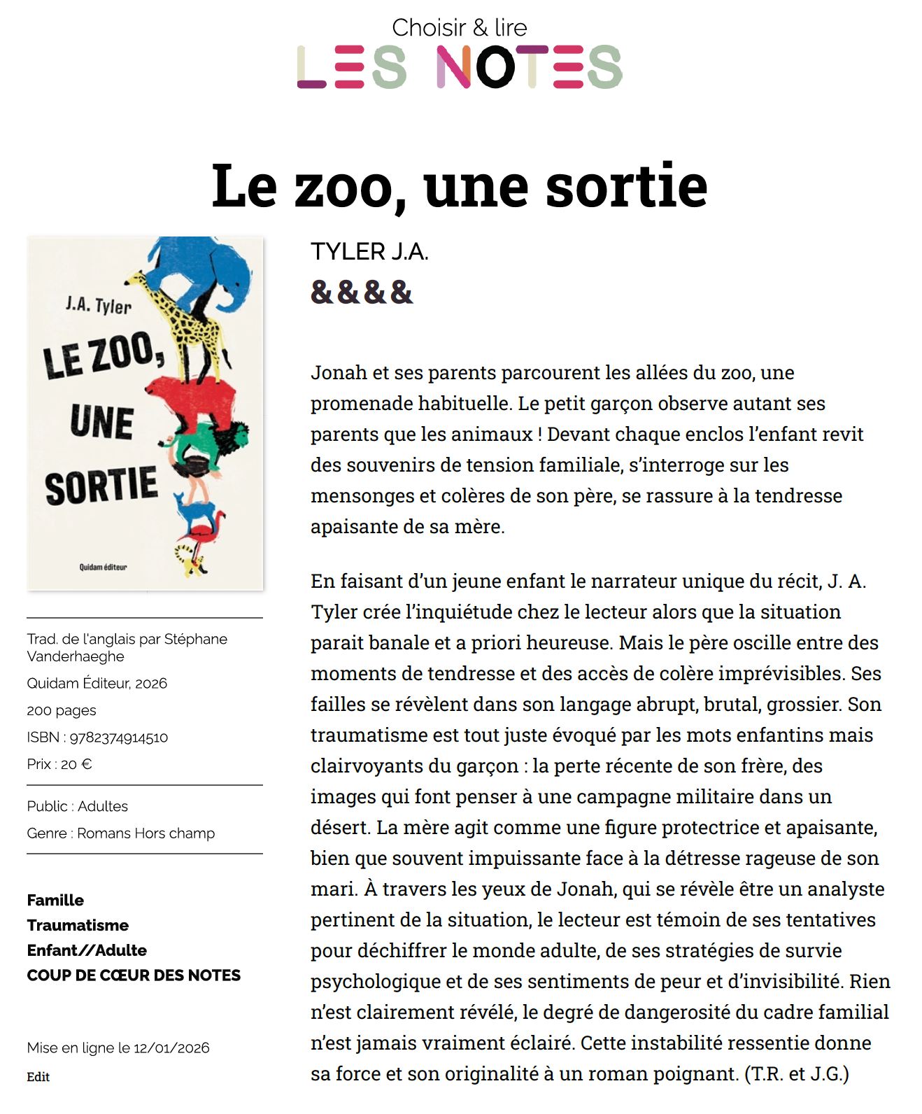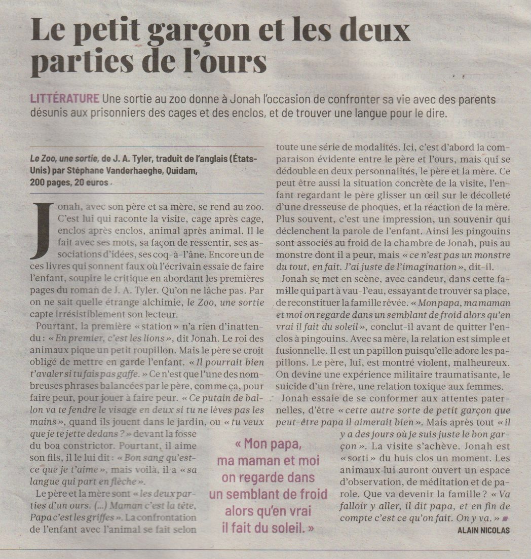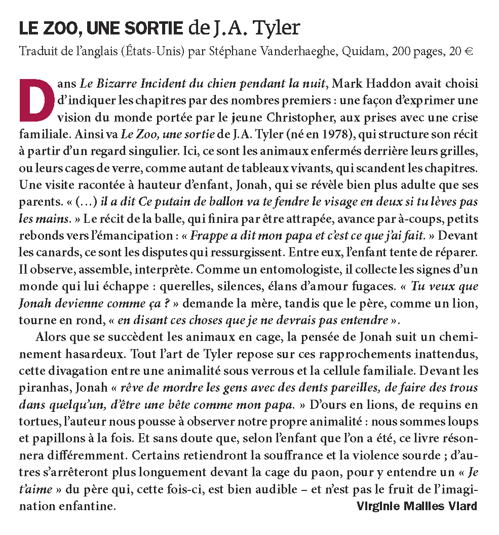 En premier c’est les lions. Mon papa et ma maman me traînent là-bas, jusqu’à la grille, jusqu’aux barreaux où je pose mes mains. La maman-lion fait dodo et le papa aussi, même qu’il bâille, ce gros lion avec les dents pointues. Sa gueule est énorme quand il l’ouvre. Il pourrait m’avaler. C’est ce que dit mon papa, il dit Jonah, il pourrait t’avaler si tu fais pas gaffe.Moi j’ai pas envie de me faire avaler. J’ai pas envie de penser à ce lion qui pourrait m’avaler avec sa gueule ouverte, toutes ces dents pointues. Je me bouche les oreilles. Je fais ça des fois quand papa il parle. J’utilise la paume de mes mains que je colle dessus et comme ça j’entends plus rien.