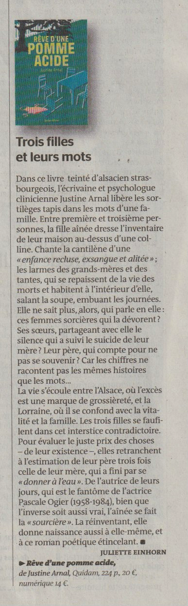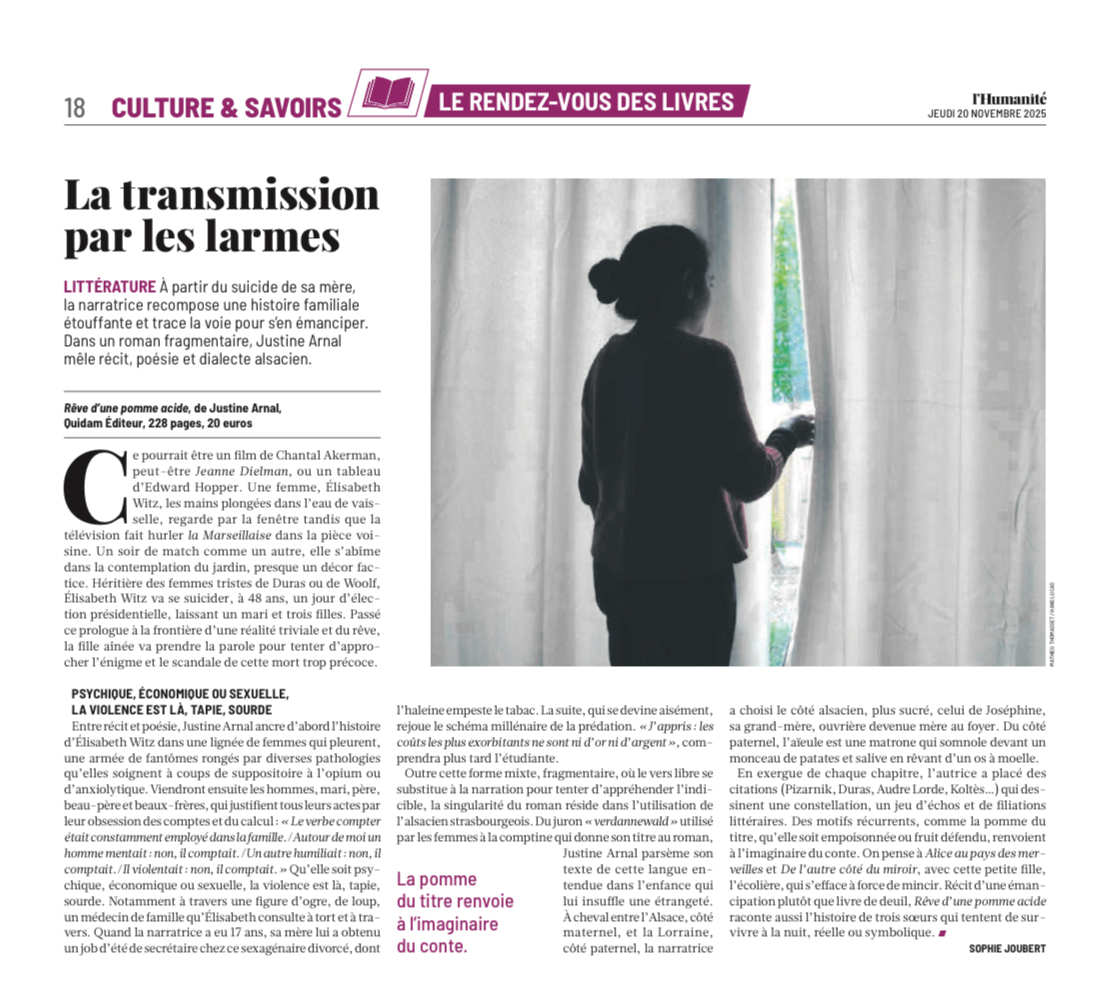 « En Lorraine, une part de quiche. En Alsace, une tarte flambée », à mi-chemin entre les deux, un lotissement, une famille et un suicide. Celui d’Élizabeth Vitz, une Alsacienne mariée à Éric Richard, un lorrain. Mère de trois filles qui resteront sans nom : l’étudiante, la lycéenne et l’écolière. À la fois grave et légère, Justine Arnal exhibe dans Rêve d’une pomme acide la laideur de la vie ordinaire qui met au monde des orphelins.
